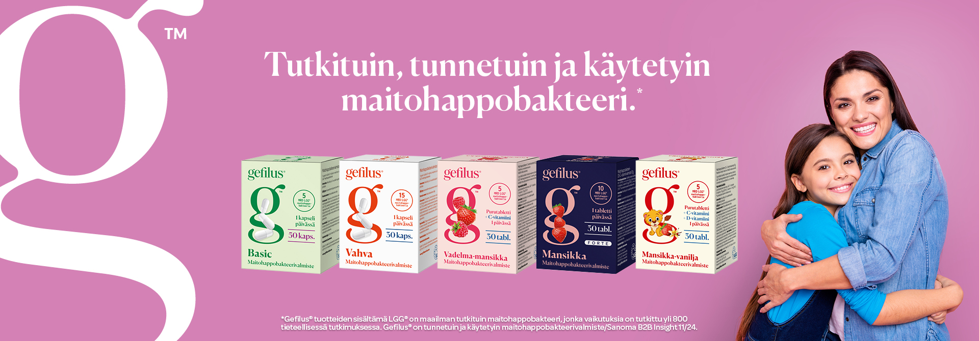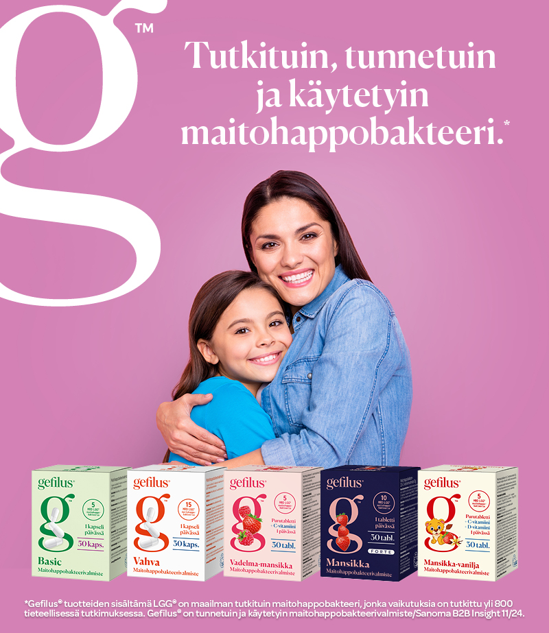 *Gefilus® maitohappobakteerivalmisteiden sisältämä LGG® on maailman tutkituin maitohappobakteeri, jonka vaikutuksia on tutkittu yli 800 tieteellisessä tutkimuksessa. Gefilus®on tunnetuin ja käytetyin maitohappoakteerivalmiste/Sanoma B2B Insight 11/2024.